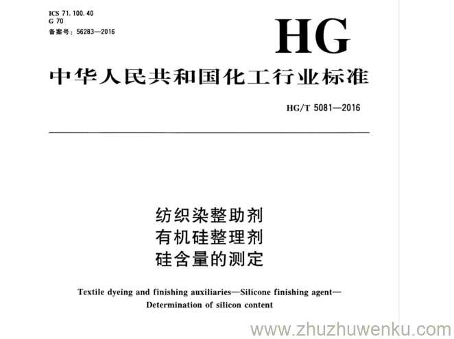 HG/T 5081-2016 pdf下载 纺织染整助剂 有机硅整理剂 硅含量的测定。 Textile dyeing and finishing auxiliaries- Silicone finishing agent- Determination of silicon content .