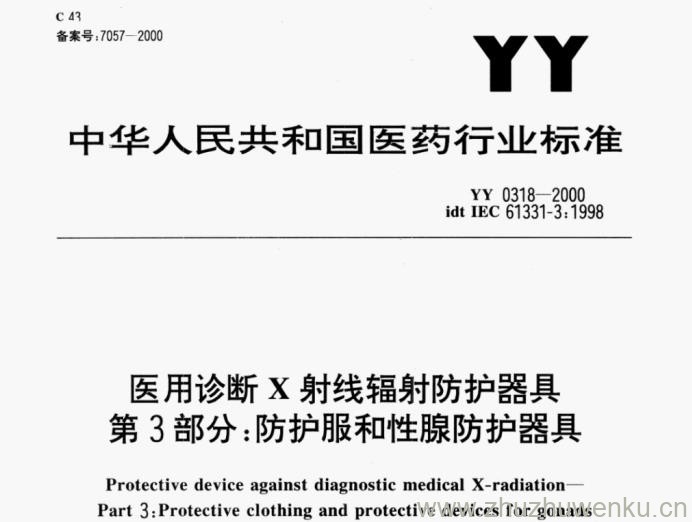 YY 0318-2000 pdf下载 医用诊断X射线辐射防护器具 第3部分:防护服核性腺防护器具。Protective device against diagnostic medical X-radiation-Part 3:Protective clothing and protective devices for gonads.