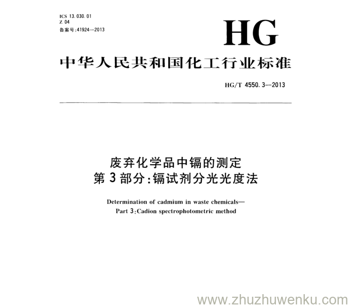 HG/T 4550.3-2013 pdf下载 废弃化学品中镉的测定 第3部分:镉试剂分光光度法。Determination of cadmium in waste chemicals- Part 3:Cadion spectrophotometric method .