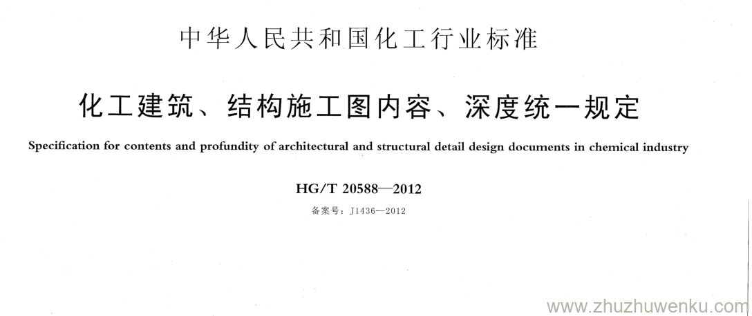 HG/T 20588-2012 pdf下载 化工建筑、结构施工图内容、深度统一规定。 Specification for contents and profundity of architectural and structural detail design documents in chemical industry .
