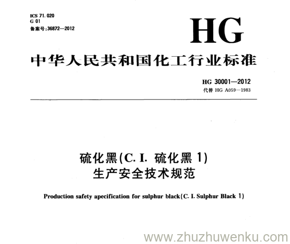 HG/T 30001-2012 pdf下载 硫化黑(C. I. 硫化黑1) 生产安全技术规范。 Production safety apecification for sulphur black (C. I. Sulphur Black 1).