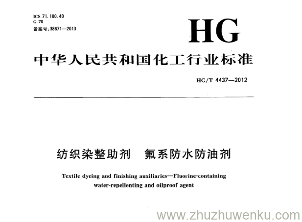 HG/T 4437-2012 pdf下载 纺织染整助剂 氟系防水防油剂。 Textile dyeing and finishing auxiliaries- -Fluorine containing water-repellenting and oilproof agent .