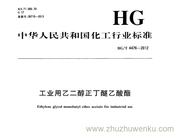 HG/T 4476-2012 pdf下载 工业用乙二醇正丁醚乙酸酯。Ethylene glycol monobutyl ether acetate for industrial use.