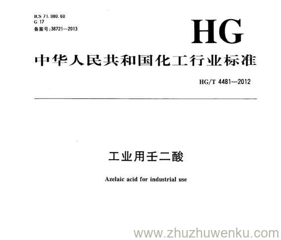 HG/T 4481-2012 pdf下载 工业用壬二酸。 Azelaic acid for industrial use .