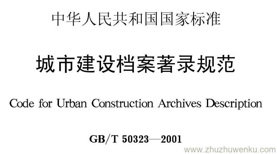根据建设部建标标[2000] 25 号的要求,由建设部会同有关部门共同制订的《城市建设档案著录规范》,经有关部门会审,批准为国家标准,编号为GB/T50323–2001,自2001年7月1日起施行。