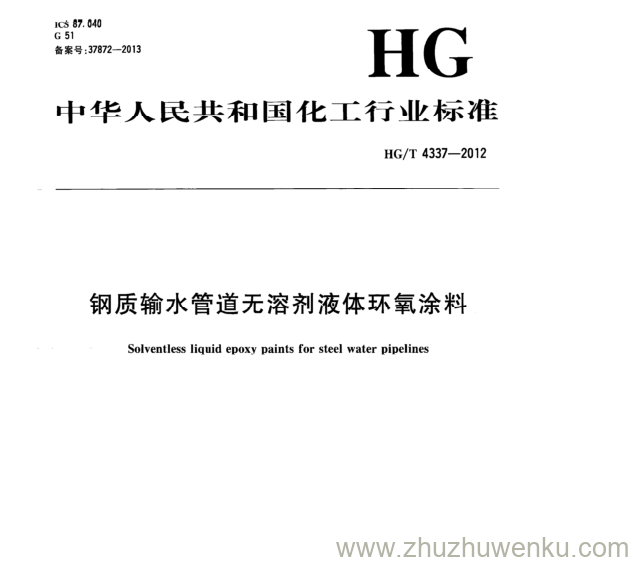 HG/T 4337-2012 pdf下载 钢质输水管道无溶剂液体环氧涂料。 Solventless liquid epoxy paints for steel water pipelines .