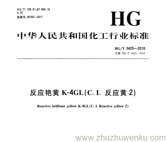 HG/T 3425-2010 pdf下载 反应艳黄K-4GL(C. I.反应黄2)。 Reactive billiant yellow K-4GL(C. 1. Reactive yellow 2) .