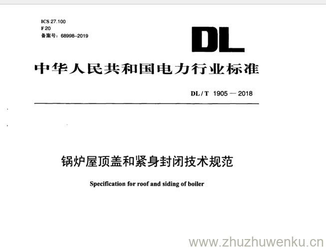 DL/T 1905-2018 pdf下载 锅炉屋顶盖和紧身封闭技术规范。Specification for roof and siding of boiler.