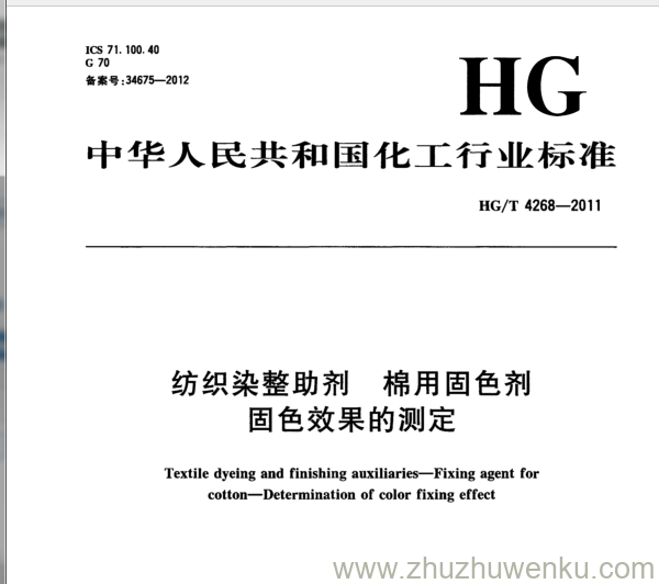 HG/T 4268-2011 pdf下载 纺织染整助剂 棉用固色剂 固色效果的测定。 Textile dyeing and finishing auxiliaries- -Fixing agent for cotton- -Determination of color fixing effect .
