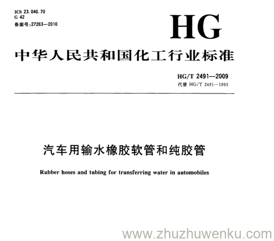 HG/T 2491-2009 pdf下载 汽车用输水橡胶软管和纯胶管。 Rubber hoses and tubing for transferring water in automobiles .