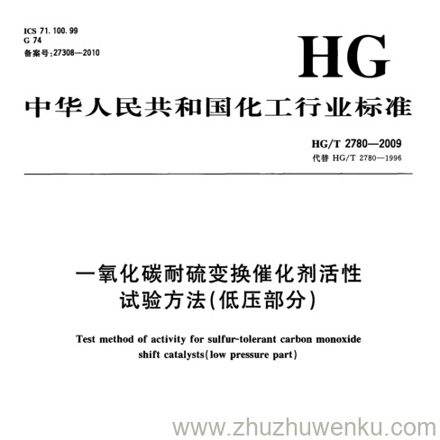 HG/T 2780-2009 pdf下载 一氧化碳耐硫变换催化剂活性 试验方法(低压部分) 。Test method of activity for sulfur-tolerant carbon monoxide shift catalysts( low pressure part) .