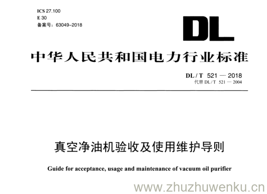 DL/T 521-2018 pdf下载 真空净油机验收及使用维护导则。Guide for acceptance, usage and maintenance of vacuum oil purifier.