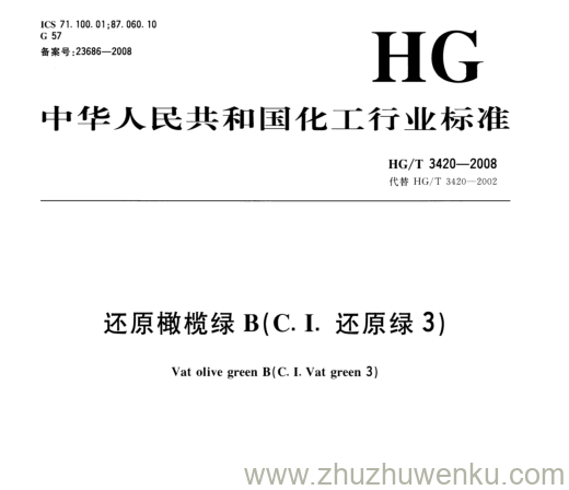 HG/T 3420-2008 pdf下载 还原橄榄绿B(C.I.还原绿3)。 Vat olive green B(C. I. Vat green 3) .