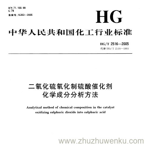 HG/T 2516-2005 pdf下载 二氧化硫氧化制硫酸催化剂 化学成分分析方法。 Analytical method of chemical composition in the catalyst oxidizing sulphurie dioxide into sulphurie acid .