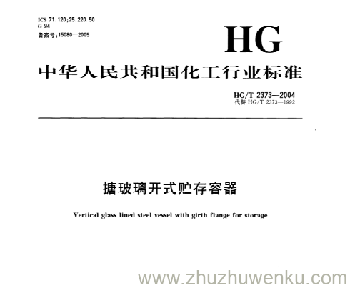 HG/T 2373-2004 pdf下载 搪玻璃开式贮存容器。 Vertieal glass lIned steel vessel with pgirth flange for storage .