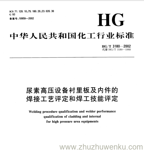 HG/T 3180-2002 pdf下载 尿素高压设备衬里板及内件的 焊接工艺评定和焊工技能评定。 Welding procedure qualification and welder performance qualification of cladding and internal for high pressure urea equipments .