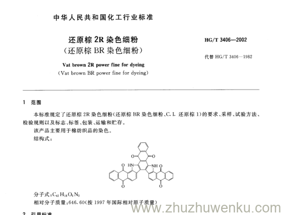 HG/T 3406-2002 pdf下载 还原棕2R染色细粉 (还原棕BR染色细粉)。 Vat brown 2R power fine for dyeing (Vat brown BR power fine for dyeing) .