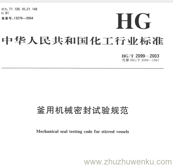 HG/T 2099-2003 pdf下载 釜用机械密封试验规范 。Mechanical seal testing code for stirred vessels .