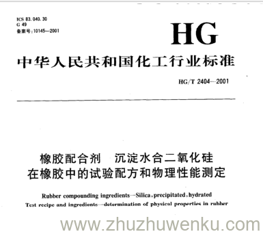 HG/T 2404-2001 pdf下载 橡胶配合剂. 沉淀水合二氧化硅 在橡胶中的试验配方和物理性能测定。 Rubber componding ingredient- silcipreipitated .hydrated Test reeipe and ingredients- delurminstion of physieal propriss in rihber .