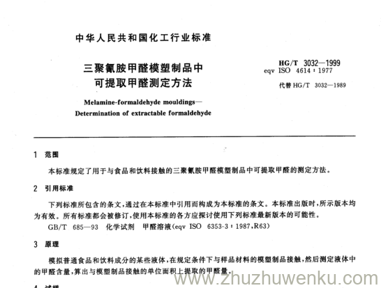 HG/T 3032-1999 pdf下载 三聚氰胺甲醛模塑制品中 可提取甲醛测定方法。 Melamine-formaldehyde mouldings- Determination of extractable formaldehyde .