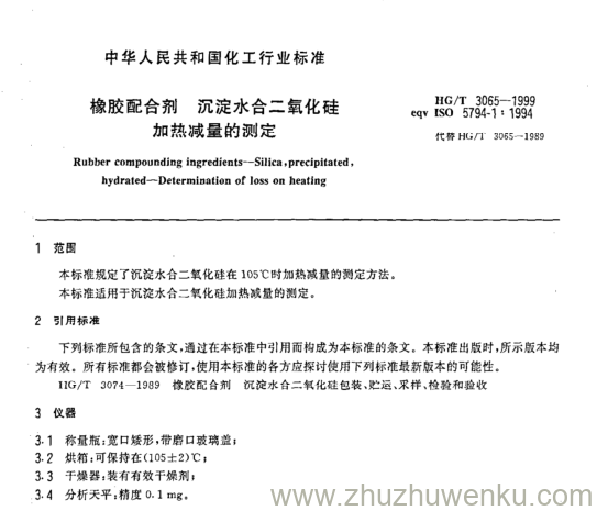 HG/T 3065-1999 pdf下载 橡胶配合剂 沉淀水合二氧化硅 加热减量的测定。 Rubber compounding ingredients– Silica , precipitated, hydrated- Determination of loss on heating .