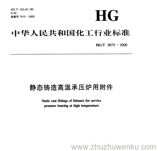 HG/T 3673-2000 pdf下载 静态铸造高温承压炉用附件。 Static cast fttings of fubnace for service pressure bearing at high temperature .