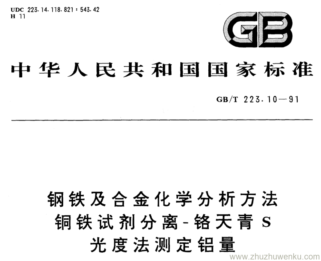 GB/T 223.10-1991 pdf下载 钢铁及合金化学分析方法 铜铁试剂分离-铬天青S光度法测定铝量