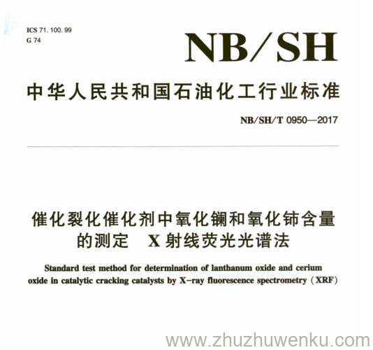 NB/SH/T 0950-2017 pdf下载 催化裂化催化剂中氧化镧和氧化铈含量 的测定X射线荧光光谱法。 Standard test method for determination of lanthanum oxide and cerium oxide in catalytic cracking catalysts by X- ray fuorescence spectrometry (XRF) .