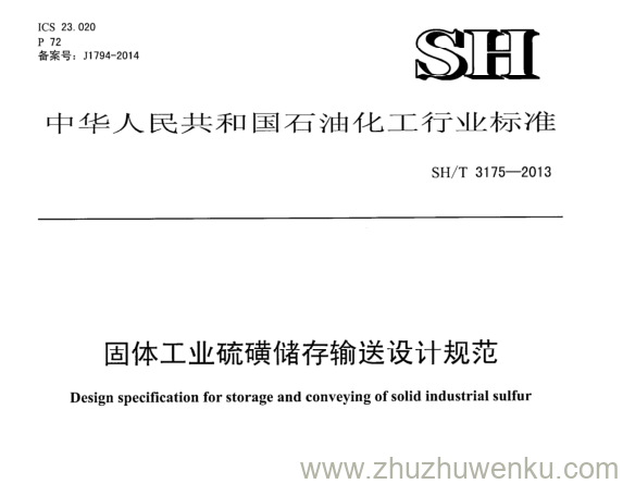 SH/T 3175-2013 pdf下载 固体工业硫磺储存输送设计规范。 Design specification for storage and conveying of solid industrial sulfur .