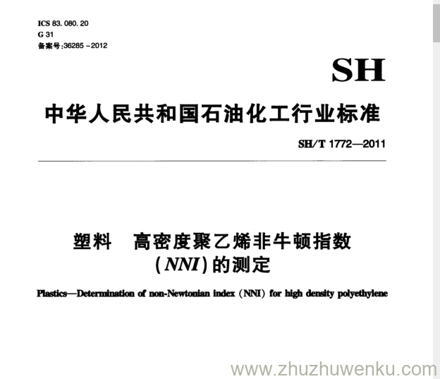 SH/T 1772-2011 pdf下载 塑料离密度聚乙烯非牛顿指数 (AWJ) 的测定。 Plastics~Detemnnatlmi of non-Newtonian index (NNI) for high density pdyethylene.