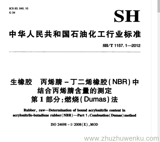 SH/T 1157.1-2012pdf下载 生橡胶 丙烯腈-丁二烯橡胶( NBR)中 结合丙烯腈含量的测定 第1部分:燃烧( Dumas)法