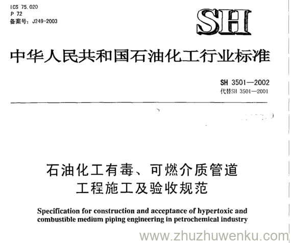 SH/T 3501-2002 pdf下载 石油化工有毒、可燃介质管道 工程施工及验收规范。 Specification for construction and acceptance of hypertoxic and combustible medium piping engineering in petrochemical industry .