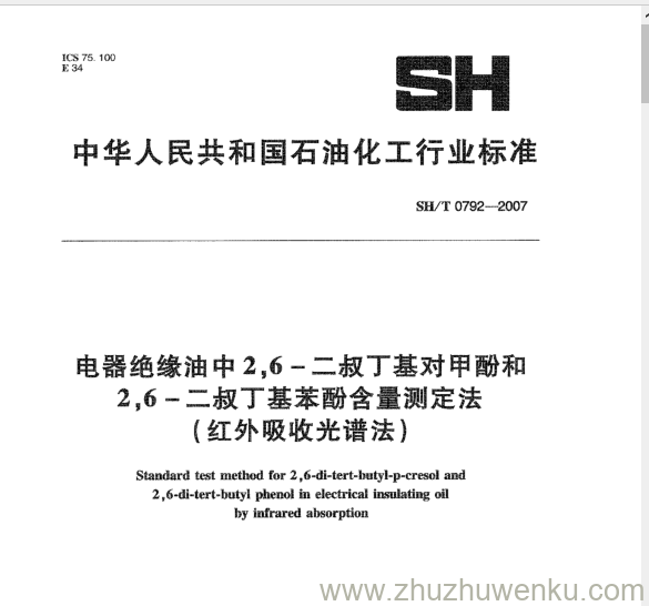 SH/T 0792-2007 pdf下载 电器绝缘油中2,6-二叔丁基对甲酚和 2,6-二叔丁基苯酚含量测定法 (红外吸收光谱法)