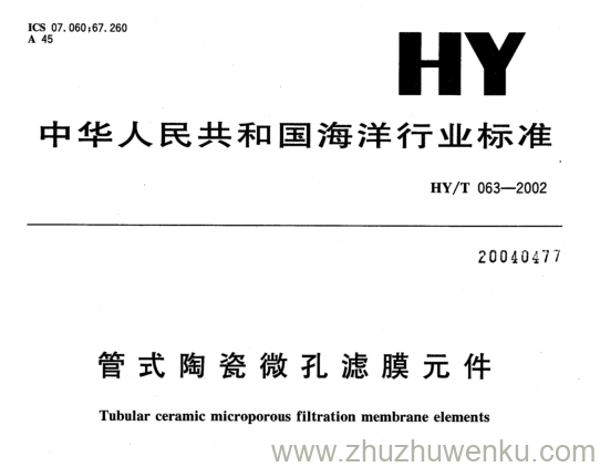 HY/T 063-2002 pdf下载 管式陶瓷微孔滤膜元件。 Tubular ceramic microporous filtration membrane elements .