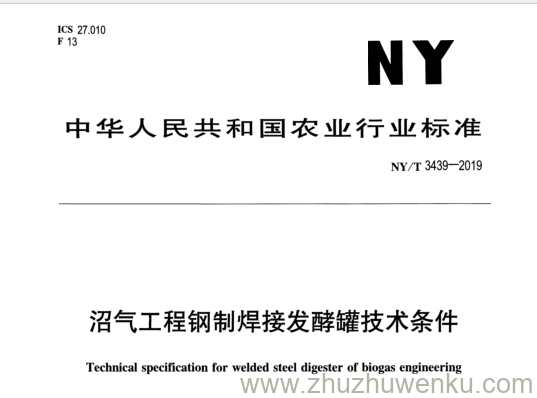 NY/T 3439-2019 pdf下载 沼气工程钢制焊接发酵罐技术条件。 Technical specification for welded steel digester of biogas engineering.