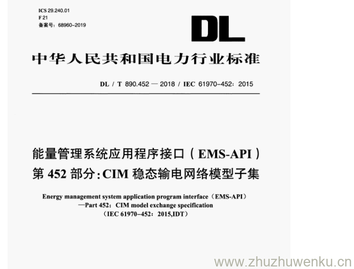 DL/T 890.452-2018 pdf下载 能量管理系统应用程序接口(EMS-API) 第 452 部分:CIM 稳态输电网络模型子集。Energy management system application program interface(EMS-API) -Part 452:CIM model exchange specification (IEC 61970-452:2015,IDT).
