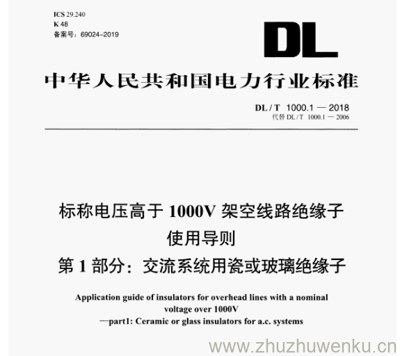 DL/T 1000.1-2018 pdf下载 标称电压高于 1000V 架空线路绝缘子 使用导则 第1部分:交流系统用瓷或玻璃绝缘子。Application guide ofinsulators for overhead lines with a nominal voltage over 1000V part1: Ceramic or glass insulators for a.c. systems.