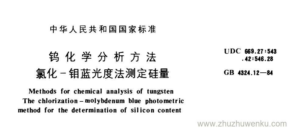 GB/T 4324.12-1984 pdf下载 钨化学分析方法 氯化-钼蓝光度法测定硅量