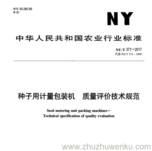 NY/T 371-2017 pdf下载 种子用计量包装机质量评价技术规范。 Seed metering and packing machines— Technical specification of quality evaluation.