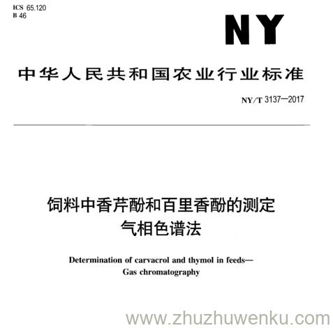 NY/T 3137-2017 pdf下载 饲料中香芹酣和百里香酣的测定 气相色谱法。 Determination of carvacrol and thymol in feeds_ Gas chromatography.