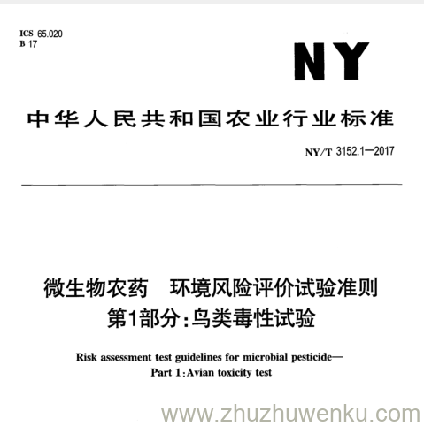 NY/T 3152.1-2017 pdf下载 微生物农药环境风险评价试验准则 第1部分:鸟类毒性试验。 Risk assessment test guidelines for microbial pesticide_ Part 1 : Avian toxicity test.