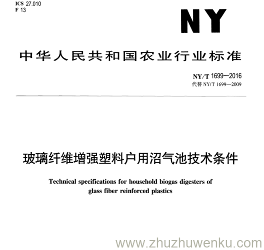 NY/T 1699-2016 pdf下载 玻璃纤维增强塑料户用沼气池技术条件。 Technical specifications for household biogas digesters of glass fiber reinforced plastics.