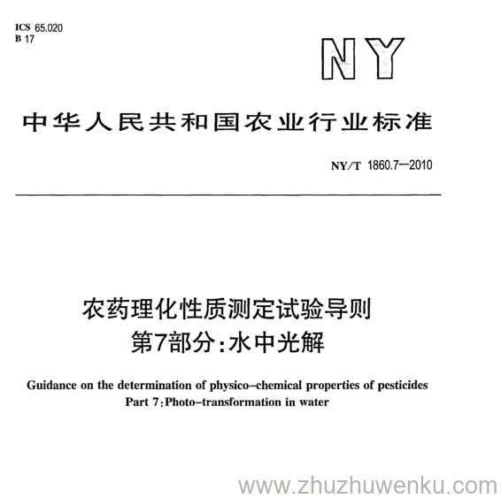 NY/T 1860.7 -2016 pdf下载 农药理化性质测定试验导则 第7部分:水中光解。 Guidance on the determination of physico- -chemical properties of pesticides Part 7:Photo- -transformation in water .