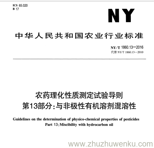 NY/T 1860.13-2016 pdf下载 农药理化性质测定试验导则 第13部分:与非极性有机溶剂混溶性。 Guidelines on the determination of physico-chemical properties of pesticides Part 13-.Miscibility with hydrocarbon oil.