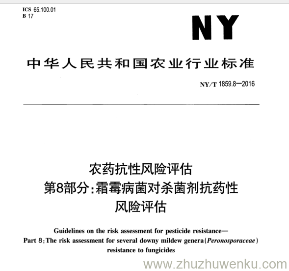 NY/T 1859.8-2016 pdf下载 农药抗性风险评估 第8部分:霜霉病菌对杀菌剂抗药性 风险评估 。Guidelines on the risk assessment for pesticide resistance- Part 8:The risk assessment for several downy mildew genera(Peronosporaceae ) resistance to fungicides .