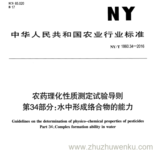 NY/T 1860.34-2016 pdf下载 农药理化性质测定试验导则 第34部分:水中形成络合物的能力。 Guidelines on the determination of physico-chemical properties of pesticides Part 34 : Complex formation ability in water.