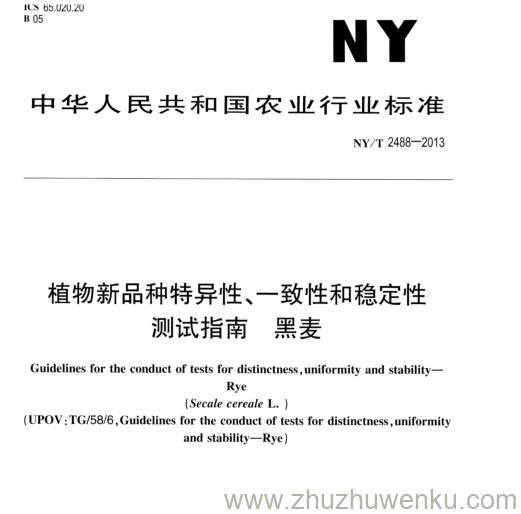 NY/T 2488-2013 pdf下载 植物新品种特异性、–致性和稳定性 测试指南黑麦。 Guidelines for the conduct of tests for distinctness , uniformity and stability- Rye .