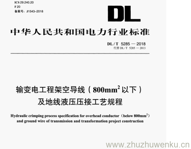 DL/T 5285-2018 pdf下载 输变电工程架空导线(800mm以下) 及地线液压压接工艺规程。Hydrauliccrimpingprocess specification for overhead conductor(below 800mm) andground wire oftransmission and transformation project construction.
