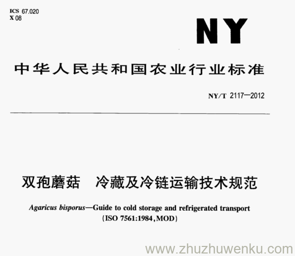 NY/T 2117-2012 pdf下载 双孢蘑菇冷 藏及冷链运输技术规范。 Agaricus bisporus- -Guide to cold storage and refrigerated transport (ISO 7561:1984 ,MOD) .