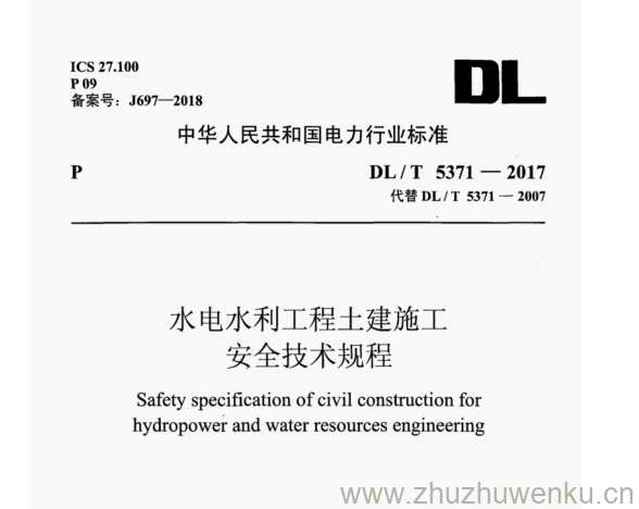 DL/T 5371-2017 pdf下载 水电水利工程土建施工 安全技术规程。Safety specification of civil construction for hydropower and water resources engineering.